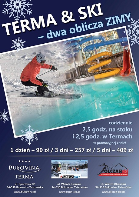 Szaleństwo na stoku, a później relaks w gorących wodach termalnych ? Dlaczego nie. Bukowina Tatrzańska kusi turystów i miłośników białego szaleństwa podwójną przyjemnością – ofertą Terma&Ski. Od 14 stycznia 2013 roku kompleks BUKOVINA Terma Hotel Spa wraz z ośrodkami narciarskimi Rusiń-ski oraz Olczań-ski, oferują kompleksowy pakiet wejść na bukowińskie Termy i wyciągi narciarskie w niskiej cenie.